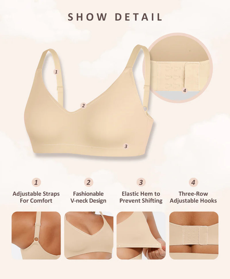 Say goodbye toawkward back bulgesand peek-a-boo straps! Theseamless back designstays invisible under tight tops, while the wide underband locks in support without squeezing.Confidence looks flawlessfrom every angle!